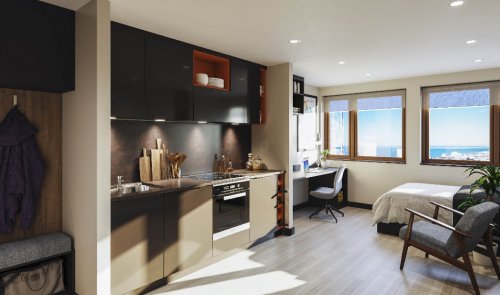 Choose from two types of studio rooms at Vogue Studios. You’ll find a comfy double bed, plenty of space, your own private en-suite shower and a kitchenette area waiting for you when term starts. All prices shown are per person, per week including fast WiFi, contents insurance and bills. We also offer accessible room options.